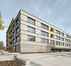 | | Das fünfgeschossige Schulprojekt „Stockbrünnele“ in Böblingen wurde als Holz-Hybridbau realisiert. Zwei L-förmige Baukörper mit Innenhof schaffen offene Lern- und Begegnungsräume. Als Sonderbau (GK 5) mit je sechs Nutzungseinheiten pro Geschoss begleitete Sinfiro das Projekt brandschutztechnisch. Das Gebäude ist in zwei Brandabschnitte gegliedert, mit mineralischem Sockel, Massivholz-Obergeschossen, feuerbeständigem Tragwerk und gesicherten Fluchtwegen gemäß LBO. Weitere Informationen