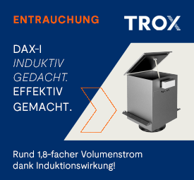 | | Der DAX-I (Dachventilator axialer Bauart mit Induktionswirkung) von TROX X-FANS: Rund 1,8-facher Volumenstrom durch Induktionswirkung. Unempfindlich gegenüber starkem Wind, Schnee und PV-Aufständerung. DAX-I von TROX X-FANS: Das sichere, robust arbeitende und energieeffiziente Wirkprinzip setzt neue Maßstäbe in der Entrauchung.