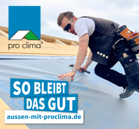 | | Für beste Ergebnisse im Handwerk zählen zwei Dinge: Können und erstklassiges Material. Wer hier Kompromisse macht, verliert. Deshalb stecken wir bei pro clima seit Jahrzehnten Herzblut und Know-how in Entwicklung und Fertigung von Bahnen für Unterdeckung, Fassade und Bauzeitenschutz. Das Ergebnis: High-End-Membranen, millionenfach bewährt, unabhängig getestet und ausgezeichnet – zuverlässig über Jahrzehnte, zum Schutz von Gebäuden und ihrer Nutzer – über Jahrzehnte. So bleibt das gut! Weitere Informationen