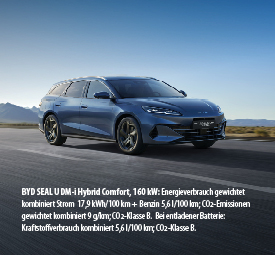 | | Wo Visionen Raum finden: Der SEAL 6 DM-i Touring Comfort vereint Funktion und Design zu einem Firmenwagen, der Effizienz und Flexibilität neu definiert. Mit bis zu 1.350 km Reichweite und 675 bis 1.535 Litern Ladevolumen bietet er Platz für Pläne, Modelle und Ideen. Der intelligente Antrieb sorgt für Dynamik und Wirtschaftlichkeit.