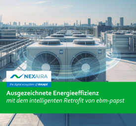 Das intelligente Retrofit mit NEXAIRA.Fit von ebm-papst hebt Ihre Klimasysteme auf ein neues Niveau – mit 360° Monitoring für maximale Transparenz, erhöhter Betriebssicherheit und Energieeinsparungen von bis zu 70%. So hilft NEXAIRA.Fit dabei, gesetzliche Anforderungen zu erfüllen und gleichzeitig Kosten zu verringern - und wurde dafür unter anderem mit dem Umwelttechnikpreis Baden-Württemberg ausgezeichnet. Jetzt entdecken!