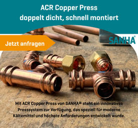| | Kupfer-Pressfittings mit doppelter Dichtung für maximale Sicherheit – auch für R32 & R290. Schnell montiert, geprüft für VRF-/Split-Anlagen und Wärmepumpen. ➜ Jetzt mehr erfahren!