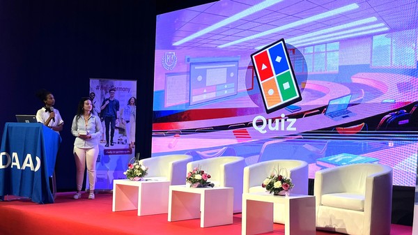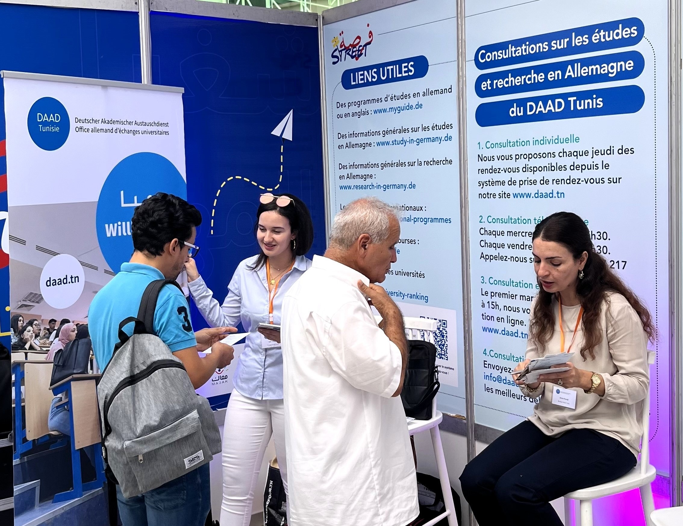 Lors de cet événement, le Bureau Régional du DAAD à Tunis a animé une présentation intitulée « Étudier en Allemagne » devant un public nombreux et curieux. Après cette intervention, un quiz interactif sur la culture, l’histoire et la géographie de l’Allemagne a été organisé. Les participants ont non seulement découvert des faits intéressants, mais ont également eu la chance de remporter des prix symboliques, renforçant l’intérêt pour les études en Allemagne. Par la suite, des consultations personnalisées ont eu lieu dans le cadre du « Labyrinthe », permettant aux jeunes de poser des questions sur les démarches à suivre pour étudier en Allemagne. Ces échanges ont témoigné d’un réel enthousiasme et d’un intérêt croissant pour les opportunités académiques et professionnelles offertes par le DAAD. Forsa Street a rassemblé un large éventail de partenaires internationaux et locaux, soulignant l’importance de la coopération dans le soutien des jeunes. Parmi les institutions présentes figuraient des organisations internationales comme l’OIM, UNICEF Tunisie, et Erasmus+, ainsi que des partenaires allemands tels que l’Ambassade d’Allemagne, la GIZ, le Goethe-Institut, l’AHK Tunisie, et bien sûr le DAAD. Grâce à des activités interactives et des ateliers enrichissants, Forsa Street a offert une plateforme unique pour guider les jeunes dans leur intégration professionnelle. Le DAAD se réjouit de cette collaboration fructueuse et reste engagé à soutenir les jeunes dans la réalisation de leurs ambitions académiques et professionnelles. | | |