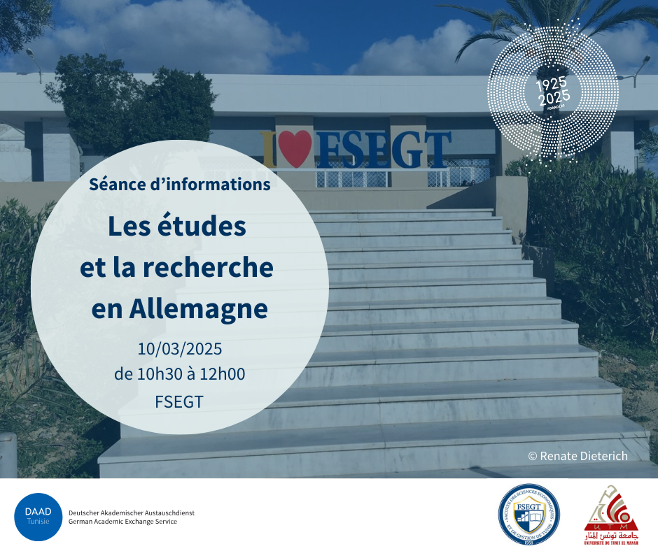 La première de ces séances d'information a eu lieu à la Faculté des Sciences Économiques et de Gestion de l’Université de Tunis El Manar (FSEGT). L’équipe du DAAD Tunis a informé les étudiants et enseignants sur les diverses opportunités d’études et de recherche en Allemagne, ainsi que sur les possibilités de financement proposées par le DAAD. La participation dynamique et les discussions animées ont mis en évidence l'intérêt considérable et l'engagement fort de la FSEGT dans la coopération académique.