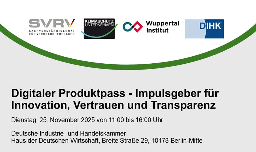 | | Die Konferenz gibt allen Teilnehmenden einen Überblick über den Status quo des Digitalen Produktpass (DPP). Außerdem widmet sie sich zentralen Herausforderungen und Chancen aus Sicht von Unternehmen, Verbraucherschutz, Politik und Zivilgesellschaft. Vor diesem Hintergrund laden die DIHK, die Klimaschutz-Unternehmen, der Sachverständigenrat für Verbraucherfragen (SVRV) und das Wuppertal Institut zur Fachveranstaltung am 25. November ins Haus der Deutschen Wirtschaft nach Berlin ein. Zur Anmeldung