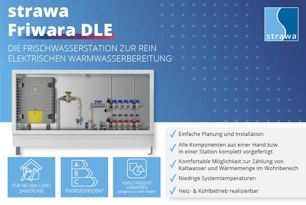 | | | | Die strawa Friwara DLE |  | Die Zukunft der elektrischen Frischwasserbereitung. Die strawa Friwara DLE ist eine elektrische Frischwasserstation für Neubau und Sanierung. Sie bietet Warmwasser, Heiz- und Kühlbetrieb, ist energieeffizient, flexibel kombinierbar (z. B. mit Fußbodenheizung), verfügt über moderne Steuerung, App-Anbindung und Sicherheitsfunktionen.