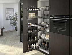 | | Die Schrankinnenausstattungen garantieren maximale Stauraumnutzung in stilvoller Optik und überzeugender Ergonomie. Das durchgängige Konzept ist individuell und variabel einsetzbar, vom klassischen Innenauszug bis zur durchdachten Hoch- und Eckschrankausstattung. Vier Designlinien bieten maximale Gestaltungsfreiheit. Ebenso sind zahlreiche Kombinationen möglich. Farblich abgestimmte Elemente in Anthrazit greifen das Design anderer Hettich-Produkte auf und sorgen für ein stimmiges Gesamtbild. Mehr erfahren