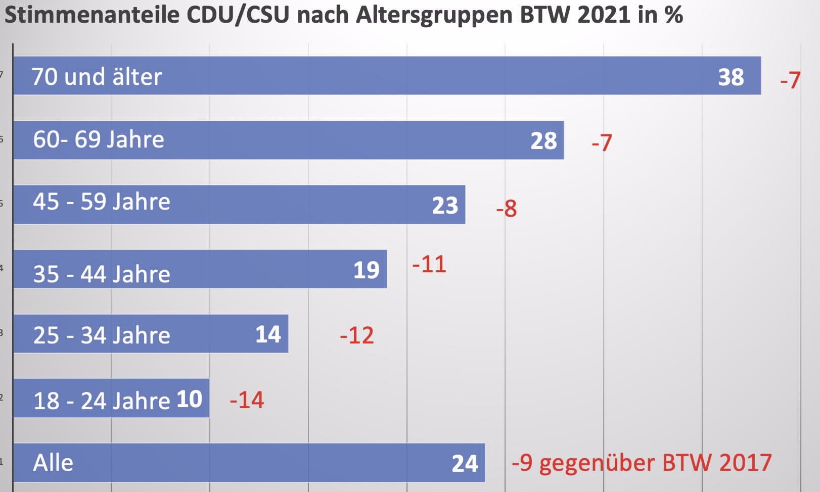 Die Union erzielte bei der Bundestagswahl am 26. September 2021 das beste Ergebnis bei den über 70-Jährigen mit 38 Prozent. Im Vergleich zur vorherigen Wahl 2017 verlor die Union in dieser Altersgruppe jedoch 7 Prozentpunkte an Unterstützung. |